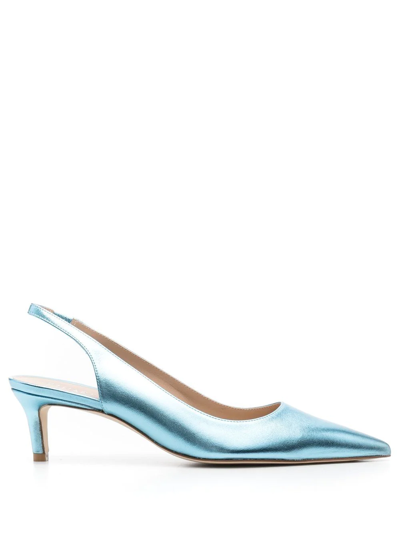 metallic-effect pointed pums from STUART WEITZMAN featuring sky blue, calf leather, leather lining, metallic effect, pointed toe, slingback strap and low heel.