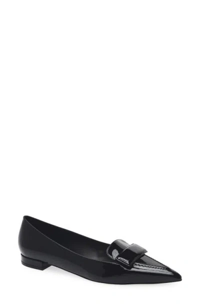 A dramatically pointed toe balances the low, walkable heel of a flat designed with a glossy finish and loafer profile accented with a floating cross strap. The sleek, low silhouette makes an effortless complement to relaxed-formal looks and smartly tailored outfits alike. Stuart Weitzman's Fall 2025 Collection debuts modern takes on the brand's timeless silhouettes, minimalist detailing and effortless sophistication with masterful, meticulous craftsmanship from artisans in Spain. Leather upper, lining and sole Made in Spain