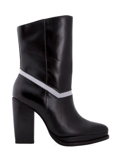 Black leather boots from STUDIO CHOFAKIAN featuring a pointed toe, contrasting panels, a side zip detail, a platform sole and a chunky high heel.