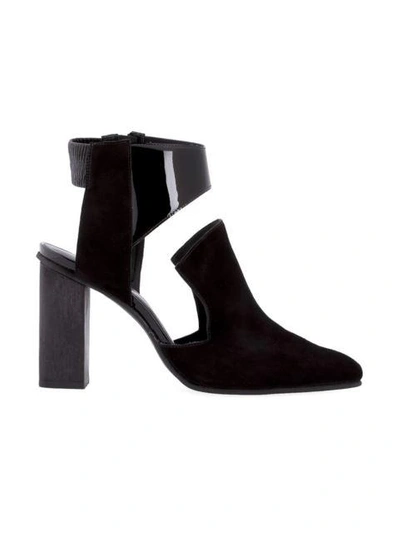 Black suede slingback mules from STUDIO CHOFAKIAN featuring a pointed toe, cut out details, patent leather and a chunky high heel.