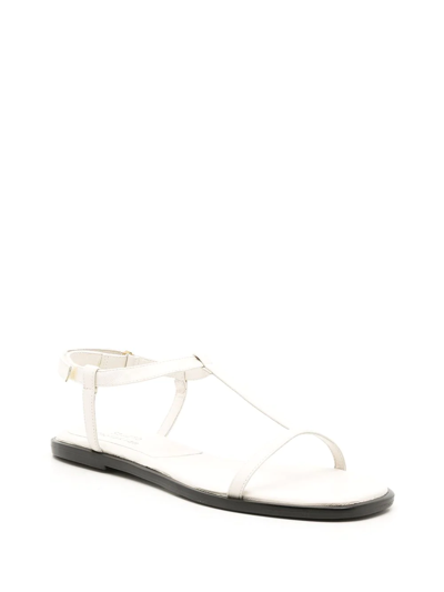 White leather Studio 100 flat sandals from Studio Chofakian featuring buckle-fastening ankle strap, low heel and strappy design.