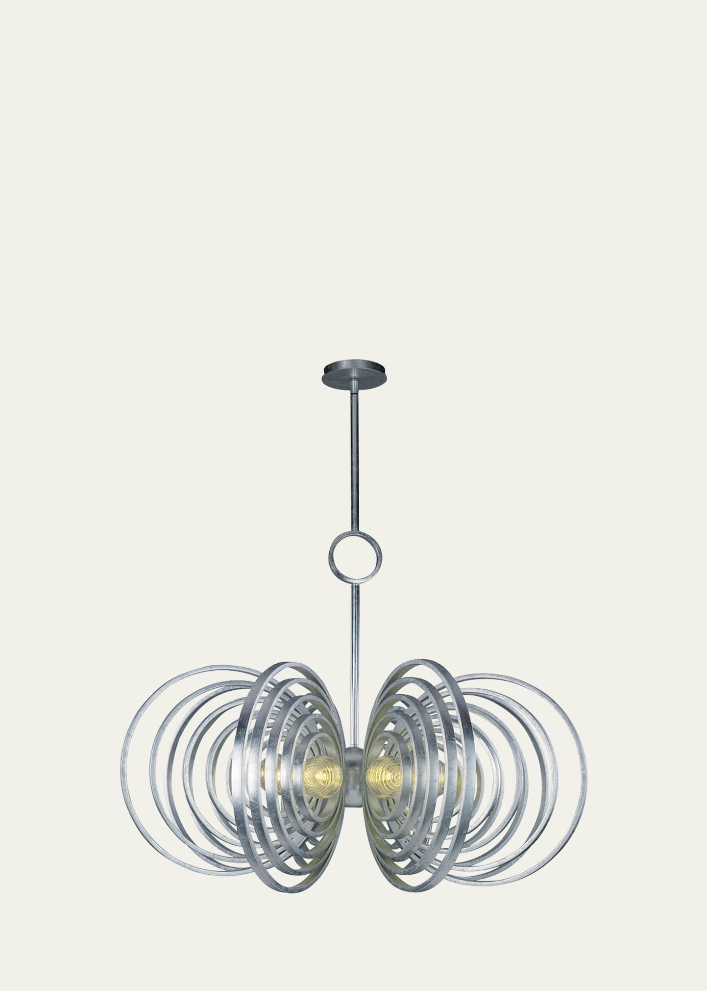 Throw a stone in a lake; observe the waves formed by the sound of music or the signal of a satellite tower. "Frequency" is an avant-garde interpretation of the classic armed chandelier with ribbed glass spheres floating in orbit within precision welded concentric ascending steel rings finished in gold or silver leaf. An LED downlight is housed within the center globe. Crafted of steel and glass Uses nine 3-watt LED bulbs (included) Pendant, approx. 38"Dia. x 16.75"T Minimum overall.