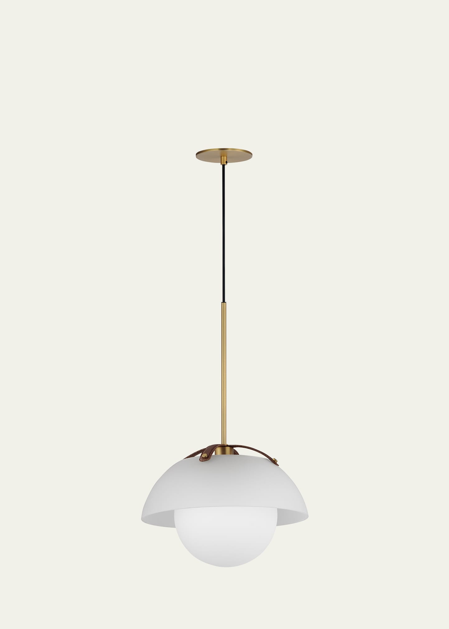 Emblematic of his casual, sophisticated style, Mat Sanders' Domain series include an all-inclusive assortment of applications and finishes Featuring a truncated sphere open at its top and bottom, an internal globe of Opal White glass shades provide ample LED lighting. The outer glass shade is suspended by a strap of stitched leather to compliment the metal finish. Available in acid-etched Satin White glass with Natural Aged Brass, crystal clear glass with polished Black Nickel, or smoke-strip...