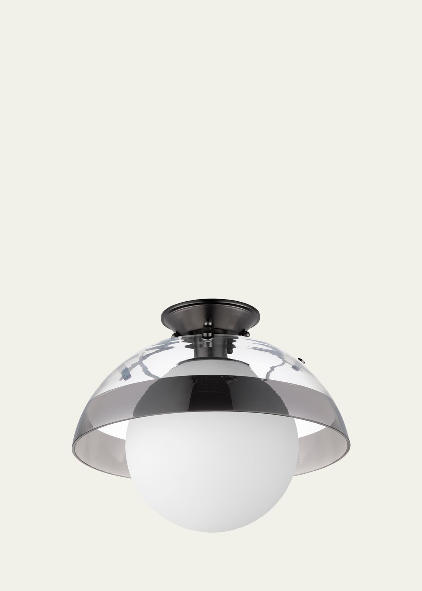 Emblematic of his casual, sophisticated style, Mat Sanders' Domain series include an all-inclusive assortment of applications and finishes Featuring a truncated sphere open at its top and bottom, an internal globe of Opal White glass shades provide ample LED lighting. The outer glass shade is suspended by a strap of stitched leather to compliment the metal finish. Available in acid-etched Satin White glass with Natural Aged Brass, crystal clear glass with polished Black Nickel, or smoke-strip...