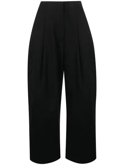 black cotton gabardine weave concealed front fastening belt loops high waist pleat detailing two side slit pockets two rear welt pockets wide leg cropped leg. Colour. : Blacks and greys. Country Of Manufacture. : Portugal. MPN. : DORDONISNW1616BLACK. .