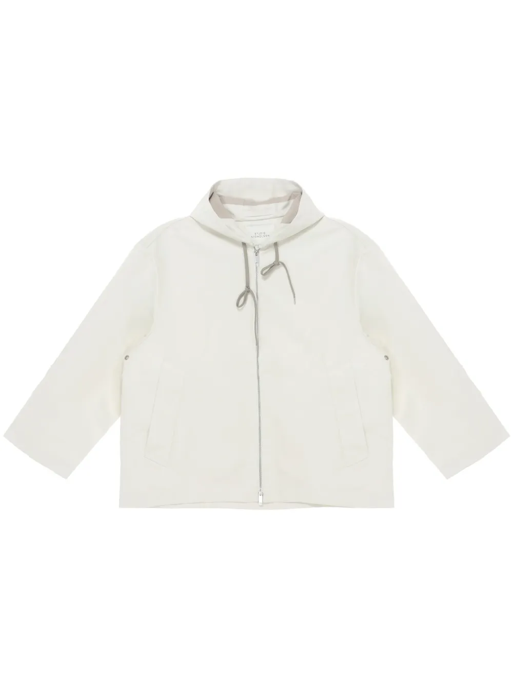light beige cotton blend waterproof front two-way zip fastening drawstring hood long sleeves two side welt pockets straight hem