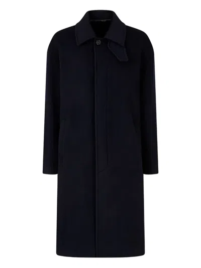 dark navy wool notched lapels long sleeves front button fastening