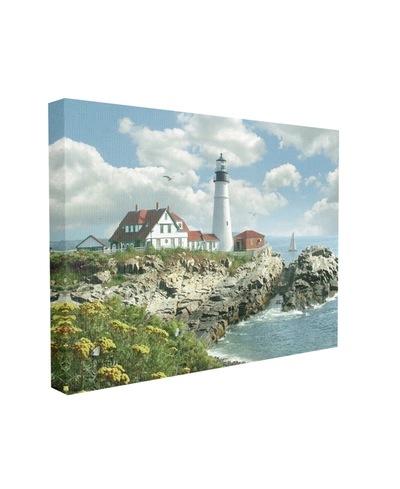 STUPELL INDUSTRIES Portland Head Lighthouse Scene Grassy Ocean Side Peninsula With Sail Boat Stretched Canvas Wall Art In Multi-color