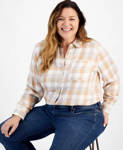 STYLE & CO Plus Size Perfect Button-front Long-sleeve Shirt, Created For Macy's In Plaid Neutral