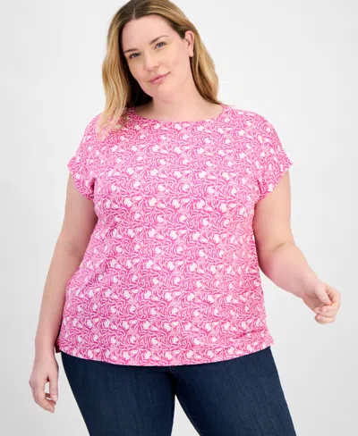 Plus Size Printed Mixed-media Relaxed Top, Exclusively At Macy's In Pink
