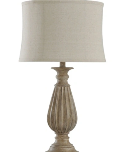 The poly-resin table lamp will fit with any other design you have in the family room. It comes with an easy-to-use metal turn knob and round, softback shade. The body comes with a brown finish along with a subtle black tint.