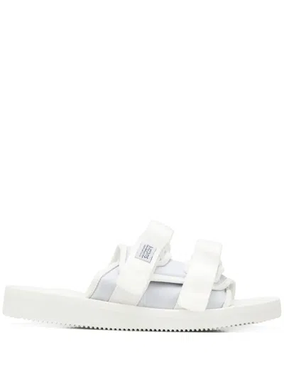 touch-strap slides from Suicoke featuring white, front touch-strap fastening, open toe, branded insole and flat rubber sole.