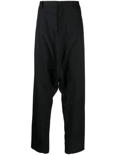 drop-crotch wool trousers from sulvam featuring black, wool, drop crotch, straight leg, mid-rise, concealed fly and button fastening, belt loops and two rear patch pockets.