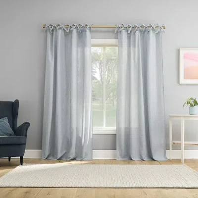 Topped with tacked bows, the Roxy Generation Slub Texture Tacked Bow Semi-Sheer Tie Top Curtain Panel from Sun Zero is a casual textured curtain with a modern style that will enhance the appearance of any living space.. Slub textured semi-sheer fabric gently filters light while enhancing privacy. The unique tie top design allows for easy installation on a standard or decorative curtain rod up to 1.5" in diameter. Panels sold individually (Image features 2 panels). Measure carefully prior to purchase.Number of Panels: 1Included: 1 Panel(s)Features: BowTop Construction: Tie TopTop Opening: 3 In Tab TopsUse: IndoorMeasurements: 63 Length/Inches, 50 Width/InchesFiber Content: 100% PolyesterLining: UnlinedLight Filtration: Light-FilteringCare: Machine WashDecor Styles: ContemporaryBack of Curtain Color: Same As Front of CurtainCountry of Origin: Imported