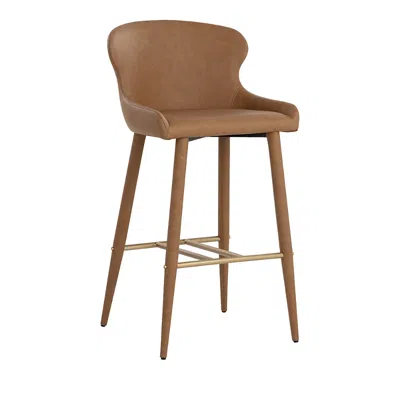 Sunpan Evora Barstool.Color:Milliken Cognac.Material:Metal frame; polyurethane faux leather upholstery; polyurethane foam fill.