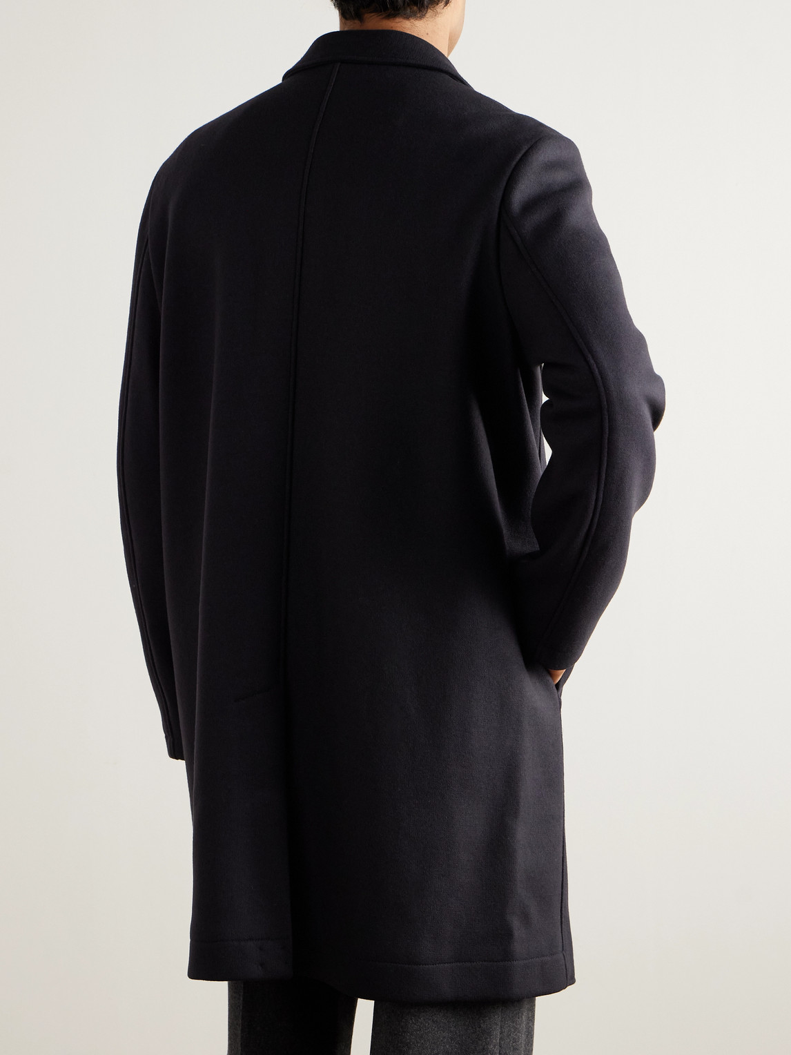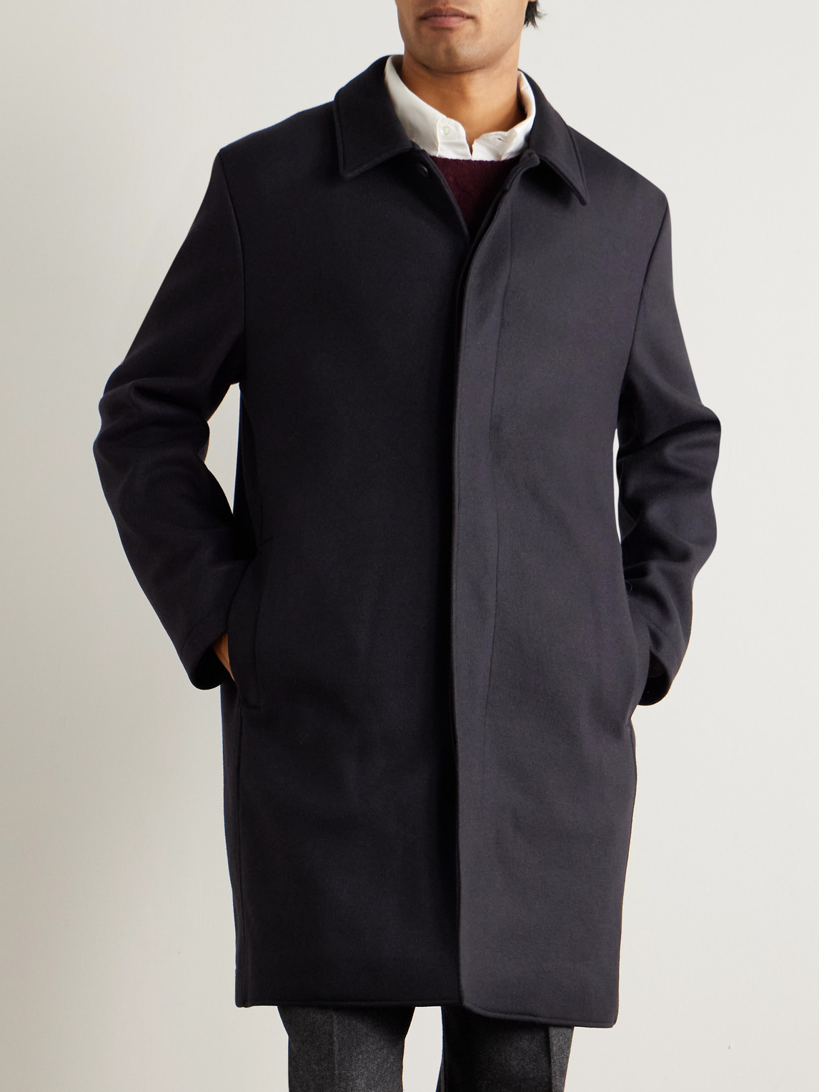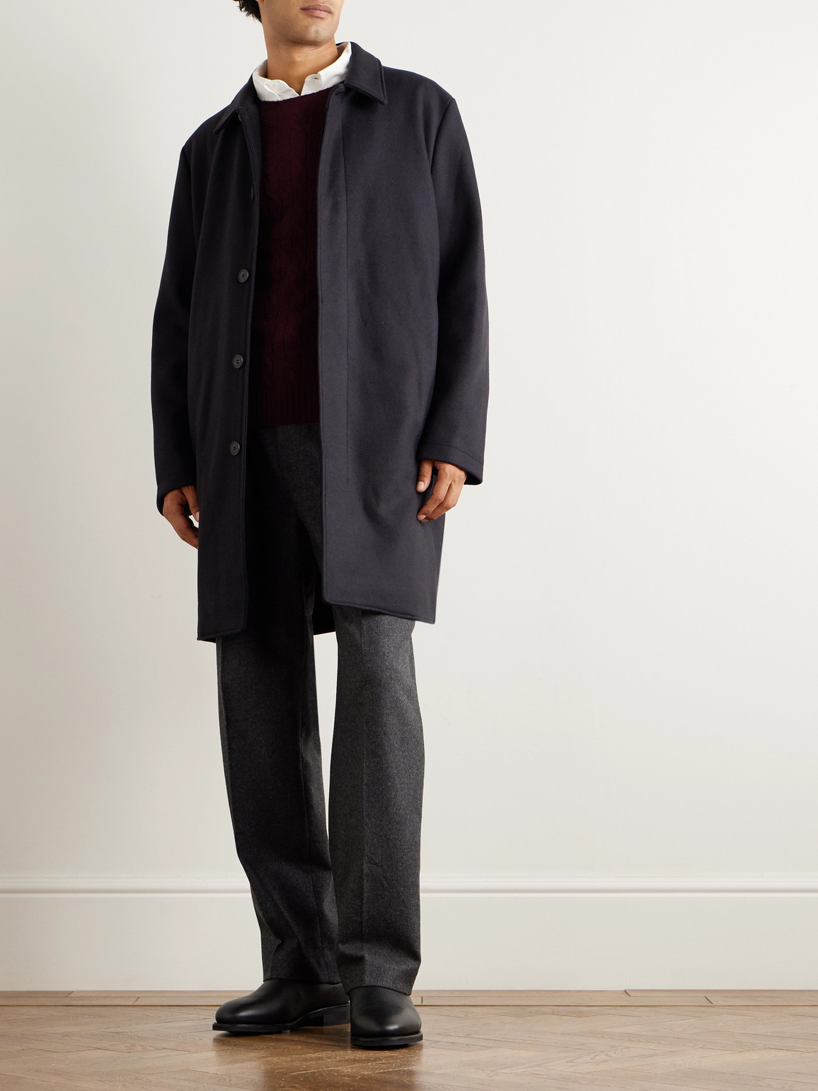 Sunspel has been making clothing using the finest fabrics for decades. This coat is tailored from an Italian wool-blend that's boiled to soften the handle and add some durability. It's cut in a streamlined profile that's intended to hit around mid-thigh and is fully lined for easy layering.