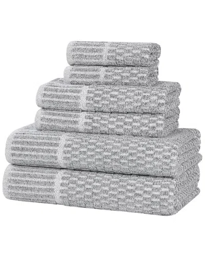 Refresh your bathroom with the Juno Cotton Blend 6-Piece Towel Set. Made from 80% cotton and 20% viscose, these soft, durable towels feature classic stripes with a playful checkered border. The set includes 2 bath towels, 2 hand towels, and 2 face towels, each with a hanging loop for easy drying. Available in Beige, Charcoal, Denim Blue, and Platinum. STANDARD 100 by OEKO-TEX certified. Machine wash gentle, tumble dry low. Dimensions:Bath towel: 30" x 54"Hand towel: 16" x 30"Face towel: 13" x 13"Soft. Stylish. Durable. # Pieces In Set: 6Included: 2 30x54 Inch Bath Towel(s), 2 16x30 Inch Hand Towel(s), 2 13x13 Inch Washcloth(s)Features: Quick DryMeasurements: 13 Width/Inches, 13 Length/InchesBase Material: 80% Cotton, 20% ViscoseFabric Description: PileCare: Machine WashDecor Styles: ModernCertifications And Listings: Oeko-Tex Standard 100Fabric Weight: Midweight (450-599 Gsm)Country of Origin: Imported
