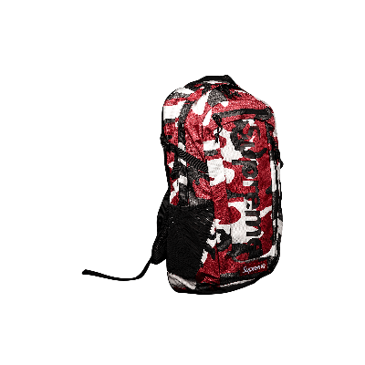 This Supreme backback from SS21 is designed in a red camo print with black accents on the straps and hardware. It features a large main compartment as well as additional zippered pockets on the front to keep items organized.