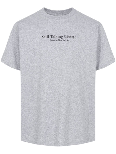 Still Talking T-shirt from SUPREME featuring grey, cotton, slogan print to the front, logo print to the rear, round neck, short sleeves and straight hem. When buying this unisex item, keep in mind that it is graded in standard men's sizing..
