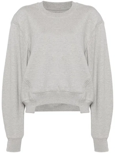 light grey cotton crew neck drop shoulder long sleeves embroidered logo to the front ribbed cuffs and hem asymmetric hem