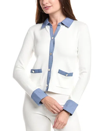 Elevate your workwear wardrobe with the T Tahari Button-Up Collared Jacket. This stylish blazer features a white star and light denim color/pattern, perfect for adding a touch of sophistication to any outfit. The design details include a spread collar, two front pockets, and contrast trim for a modern twist. Made with a blend of 72% viscose and 28% polyester, this jacket offers both comfort and style. Complete with a button front closure and imported craftsmanship, this versatile piece is a must-have for the fashion-forward woman. Pair it with your favorite trousers or skirts for a polished look that will take you from the office to happy hour effortlessly.