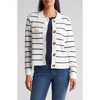 Collar Button Front Cardigan In Snow Globe/navy Stripe