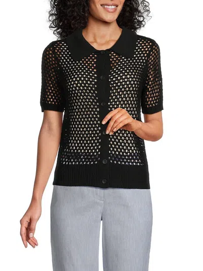 T Tahari Crochet Top Womens Small Black Open Front Collared Button Front FTS1424
