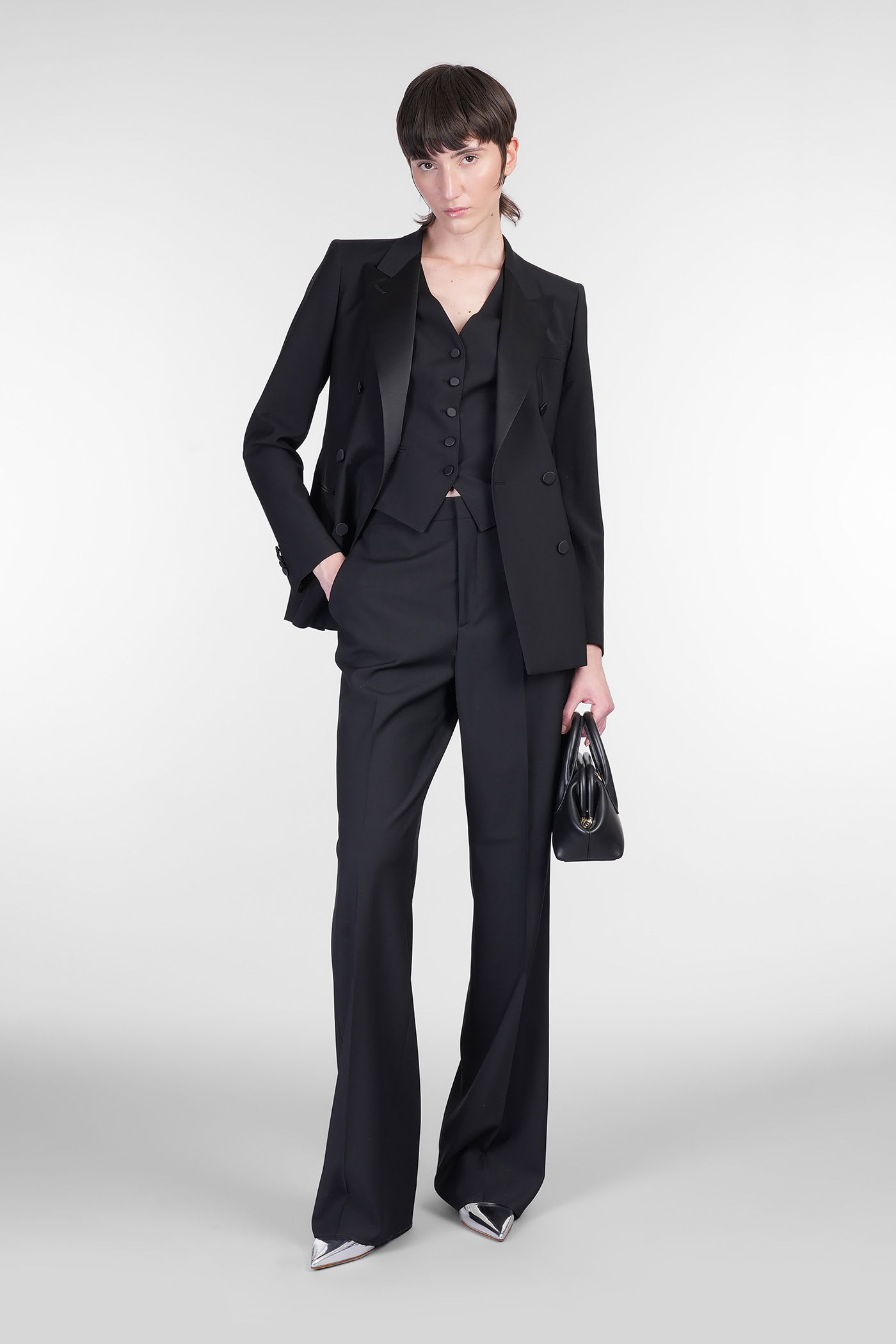 Giselle Vest in black wool, V neck, sleeveless, frontal buttons closure, welt pockets, back silk detail, 100% Virgin Wool, Made in Italy, model is 180 cm and wears size 40
