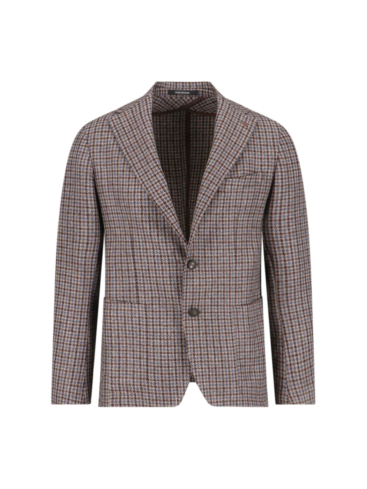 This exclusive single-breasted blazer from Tagliatore for Sugar combines classic and contemporary charm. The luxurious blend of virgin wool and cashmere showcases an elegant houndstooth pattern in rich brown, accented with chic blue and beige. Traditional details include a notch lapel, two-button closure, cuff buttons, a chest pocket, and two flat side pockets for added practicality.- Material: Virgin wool and cashmere blend - Pattern: Houndstooth in brown with blue and beige accents - Closure: Two-button - Lapel: Notch - Pockets: Chest pocket and two flat side pockets - Cuff: Buttoned cuffs