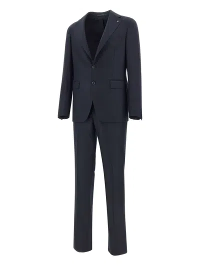 Virgin wool complete suit by tagliatore, consisting of jacket and pants. virgin wool blazer jacket, double-breasted front closure with matching buttons, two welt pockets on the front, one slit pocket on the front, wide peaked lapels, iconic brand logo applied on the lapel. virgin wool classic pants, front zipper and button closure, two side slit pockets, two welt pockets on the back, belt loops waistband. Composition: 4% % Kashmir/capra Hircus, 96% % Fleece Wool