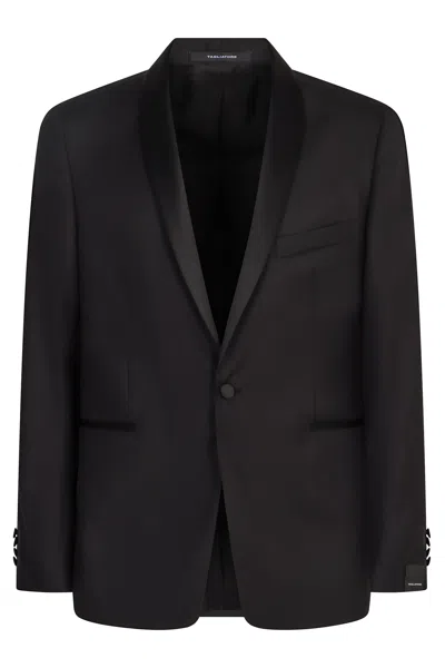 Satin lapel collar padded shoulders two welt pockets and chest pocket on the front back slit hem trousers: side pockets 100% wool Composition: 100% % Wool