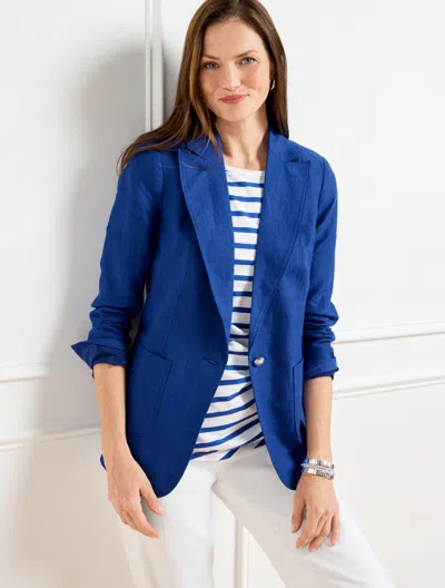 Crisp, light and soft. Elevate your spring and summer looks with this beautiful linen blazer. Tailored with figure-flattering, exposed princess seams, patch pockets and a button front. The perfect addition to your polished work to weekend looks. Features Long Sleeve Hits At Hip Button front closure Patch pockets Lined Imported Fit: Misses: 26"; Petite: 24 1/2"; Plus: 28"; Plus Petite: 26" Material: 100% Linen; Lining: 100% Polyester Care: Cover Button With Foil; Dry Clean; Turn Garment Inside Out | Plus Petite - Tailored Seaming Linen Blazer - Blue Majesty - 16 Talbots