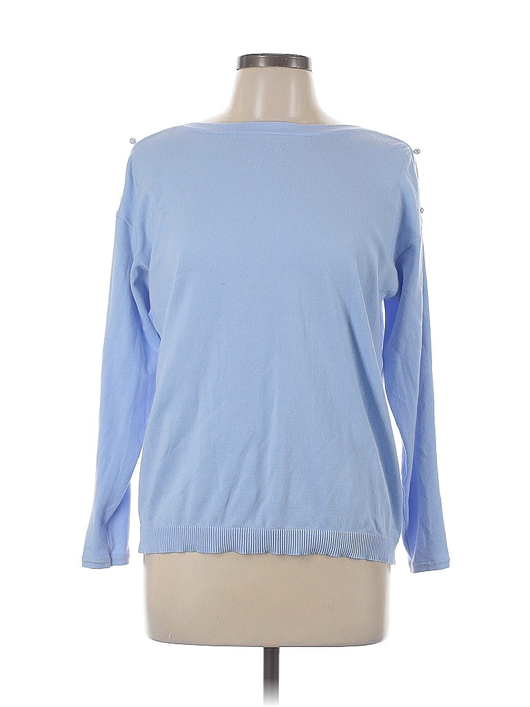 Talbots Pullover Sweater, Size: Large. Item Details: Blue, Ruffles Neckline, Long Sleeve, Frayed Edges, Women's Tops, Viscose/Polyester