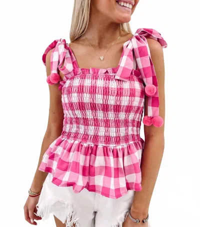 The perfect tank top for those warmer weather seasons.Embrace effortless summer style with the Be Here With Me Top by TCEC, featuring a playful magenta and white checkered pattern. This sleeveless tank top boasts adjustable tie sleeves with charming puff ball detailing and a ruffle design at the hemline. Expertly crafted from a blend of 98% polyester and 2% spandex, it promises both comfort and style. Fit details - Model is 5'6" and is wearing a size small. Closure - Tie closure. Perfect for vacation-ready looks with a trendy 90s flair.