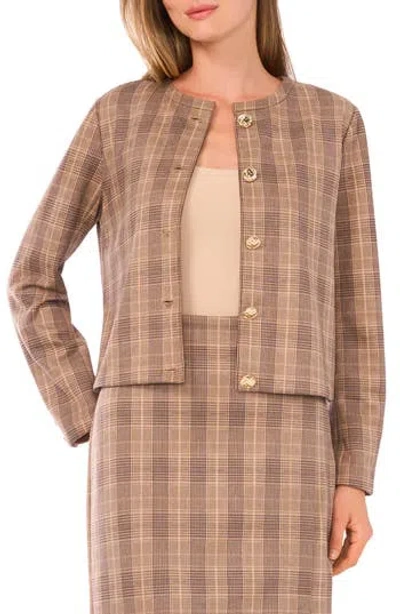 Hammered goldtone buttons bring work-to-weekend polish to this boxy jacket covered in plaid checks. Front button closure Crewneck Three-button cuffs 95% polyester, 5% spandex Machine wash, line dry Imported