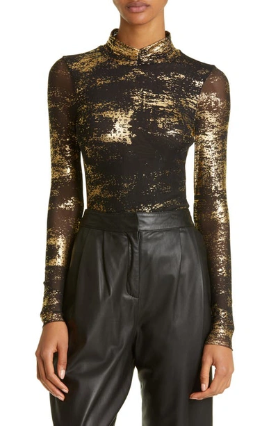 A splattered foil print brings a metallic sheen to this long-sleeve top designed in airy mesh.