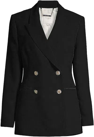 TED BAKER Women Solid Black Llayla Double Breasted Embossed Button Blazer Jacket