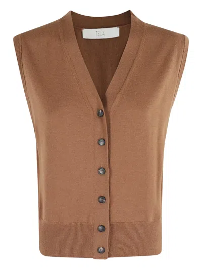 The Dane vest by Tela is a contemporary piece made from 100% virgin wool. It showcases a sleeveless design with a refined V-neckline and a center button closure. The fitted ribbed hem adds to its elegance, while the warm brown color enhances its minimalist appeal, making it a versatile wardrobe staple.Specifications - Material - 100% virgin wool Design - Sleeveless Neckline - V-neck Closure - Center button Hem - Fitted ribbed Color - Warm brown