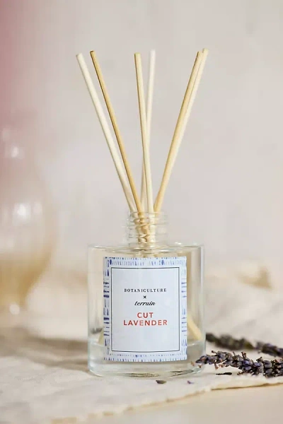 Made exclusively for terrain, this reed diffuser brings sophistication and serenity to any space in your home with its long-lasting fragrance. Scent Notes Cut Lavender: lavender, rose, pine, musk, vanilla, cedarwood, sandalwood Grapefruit Blossom: grapefruit, orange, lemon, mint, raspberry, vanilla, musk Honeysuckle Vine: fresh green leaves, jasmine, gardenia, orange blossoms, raspberry, peach, musk, coconut How to use: Remove the stopper and insert reeds. Always place the diffuser on an oil-resistant surface. Gently flip the reeds weekly to increase fragrance distribution. For optimal fragrance, allow reeds to absorb fragrance oil for 24 to 48 hours before flipping. Botaniculture Reed Diffuser by Botaniculture Home Fragrance in Blue at Anthropologie