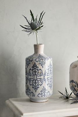 Weathered details add vintage appeal to this tall terracotta vase, wrapped in an intricate blue-and-white pattern. Damask Ceramic Vase, Tall by Terrain at Anthropologie
