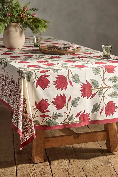 Lush and colorful thanks to a motif of oversized flowers, this cotton tablecloth is block printed by hand and finished with a border of intricate botanicals. Flora Cotton Tablecloth by Terrain in Red, Size: Large at Anthropologie