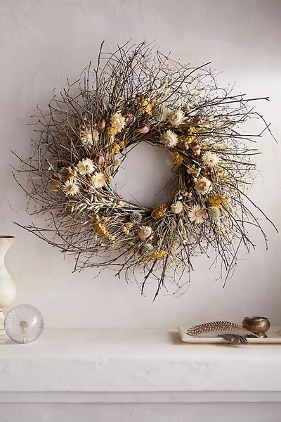 Stems of dried and preserved birch branches, quail brush twigs, yarrow, and strawflower make up this full, natural wreath. Wyeth Spring Wreath by Terrain in Yellow, Size: 22" at Anthropologie