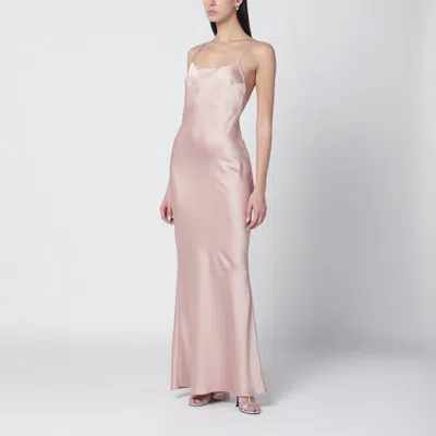 Peony-coloured satin long dress by The Andamane, featuring thin straps, open back, back draping, and rear zip closure.