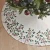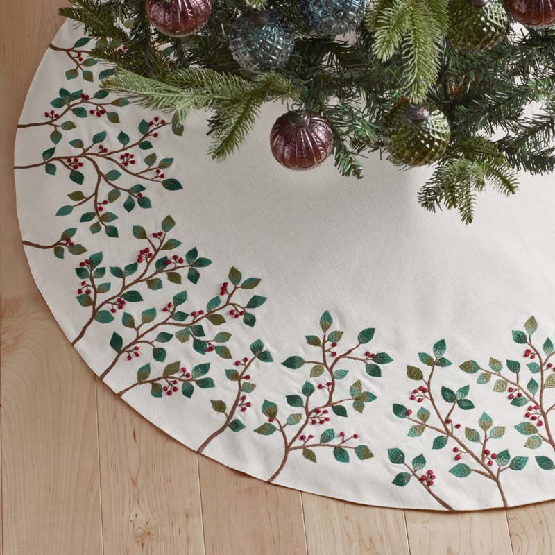 Our Legends Luxury™ Holiday Tree Skirt is artfully embellished with your choice of four beautiful themes, bringing sophistication to casual and formal decor. Choose winter berries, holiday trees, reindeer, or birds. Collection includes coordinating holiday stockings and two pillow covers (sold separately). 100% Cotton 100% Cotton Backing Both designs feature French knots, applique, metallic rice stitching, and corded embroidery done by hand-guided machines Secures with tie closures Coordinates with our table runner, pillow cover, and stocking, sold separately Due to the handcrafted nature, each piece is unique Made in India | Holiday Tree Skirt - Berries - Red, yellow, Cotton | The Company Store