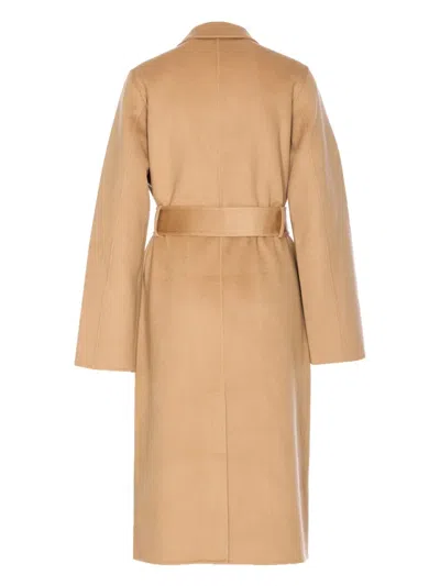 beige wool fabric double-breasted closure self-tie belt side pockets back centre-vent
