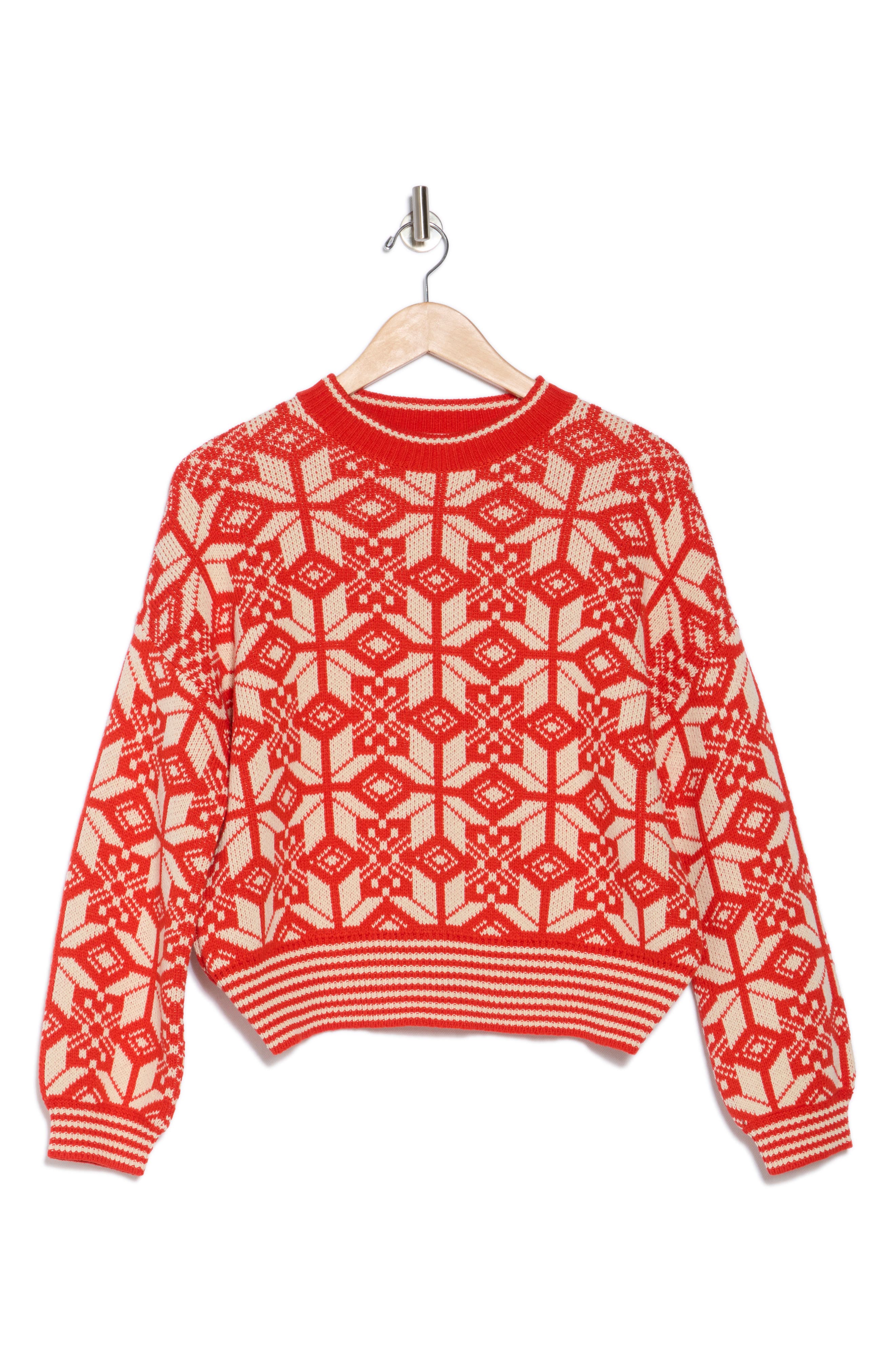 The ultimate go-to sweater, expertly crafted to provide the perfect combination of warmth and style. Its classic design and soft fabric make it a must-have addition to your wardrobe.This classic pullover design features a crew neckline, subtle blouson sleeves, and cinches in at the waist for the perfect fit. The dropped shoulders allow the silhouette to sit away from the body, making it the perfect layering piece. It features a knitted allover jacquard snowflake motif with bold stripes along the rib hem, sleeve cuff, and neckband that add a touch of Holiday spirit. 60% Cotton, 40% Acrylic. Model is 5'9 1/2" wearing size 1=Small