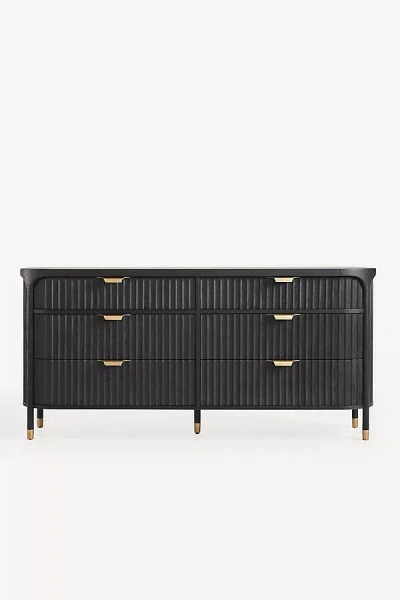 Featuring fluted-wood detailing, rounded corners, and brass-finished steel accents, the Isla Dresser makes a stunning statement in any bedroom space - alongside six drawers for optimal storage. For ordering assistance and more, please contact us For aesthetic advice and tips to help decorate your space, enjoy our complimentary home styling services The Isla Fluted-Wood Six-Drawer Dresser by The Isla Collection by Anthropologie in Black