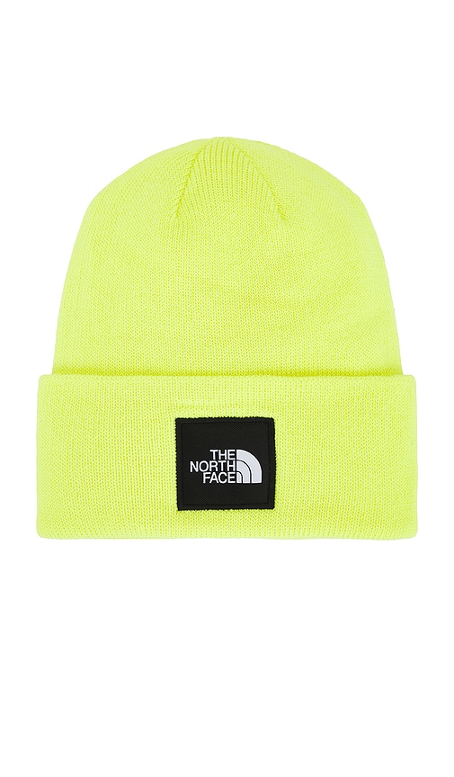 The North Face Big Box Beanie in Lemon. The North Face Big Box Beanie in Lemon. 99% polyester 1% elastane. Hand wash. Ribbed knit fabric. Logo patch at front. TACF-MA67. NF0A85CW.