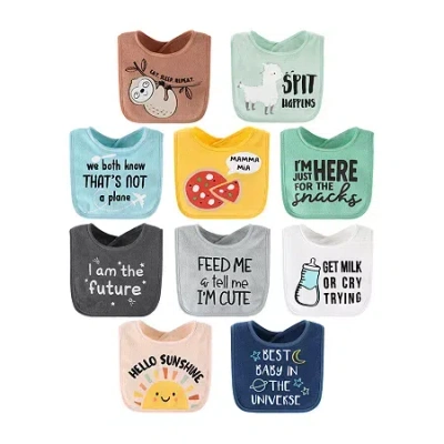 Help keep messes to a minimum with this 10 piece hello sunshine terry bib set from the peanutshell. Our assortment of fun and whimsical designs is the perfect multi-pack for feeding, teething and drooling babies. the hello sunshine collection features 10 witty sentiments in shades of teal, aqua, navy, green and yellow. The super soft 100% cotton jersey front with absorbent terry back is machine washable and fade resistant. Easy to use hook and loop closure allows for quick changes and cleanup at a terrific value that's optimal for everyday use. The stylish sayings adjust to fit newborn to toddler size. Our outfit saving essentials make a thoughtful baby shower gift for new parents. Value multipack assortment.# Pieces In Set: 10Features: Lightweight, Multi-PackClosure Type: Hook & Loop TapeMeasurements: 11 Length/Inches, 7 Width/InchesBase Material: 100% CottonFabric Description: Terry ClothCare: Machine Wash, Tumble DryCountry of Origin: Imported
