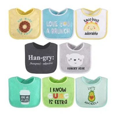 Quickly clean up your little one's adorable face from spills, spit ups, dribbles, and drool with The Peanutshell 8 pack terry bibs. A fun assortment in shades of grey, white, and yellow, mint, blue, and green featuring all your little one's favorite foods. Sweet and stylish with printed and embellished front on super-soft cotton jersey, with a soft terry reverse. Having extras on hand will always ensure that your baby's face is clean and smiling.# Pieces In Set: 8Features: LightweightClosure Type: Hook & Loop TapeMeasurements: 7 Width/Inches, 11 Length/InchesBase Material: 75% Cotton, 25% PolyesterFabric Description: Terry ClothCare: Machine WashCountry of Origin: Imported